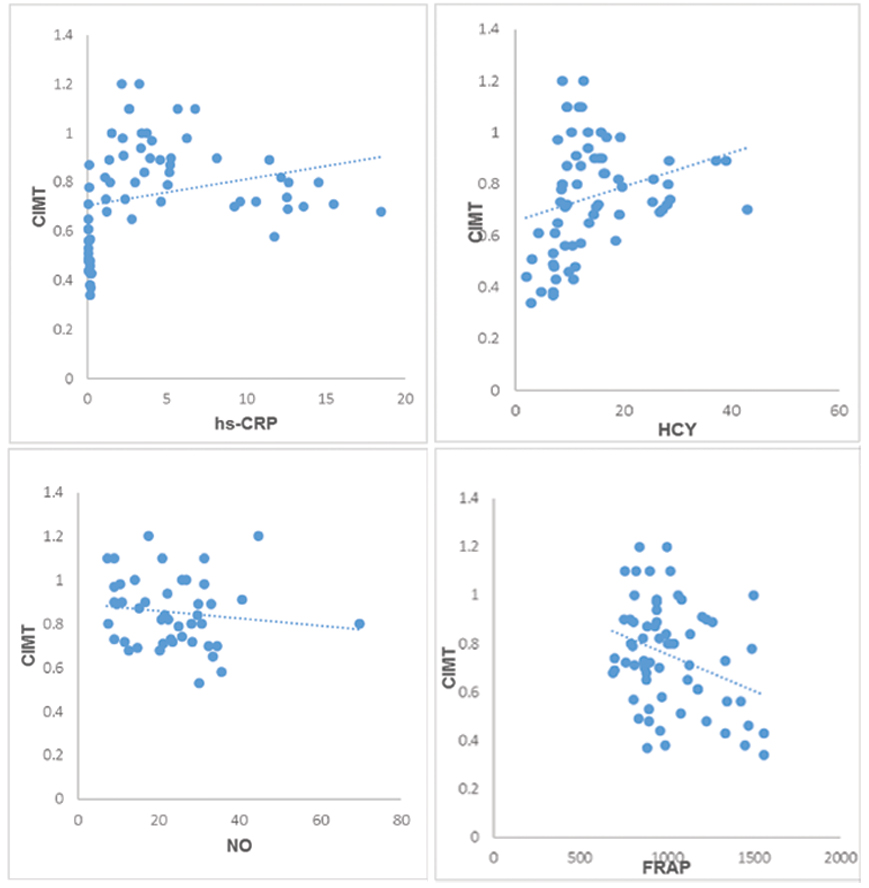Scatter plots showing association of CIMT with hs-CRP, HCY, NO and FRAP.
