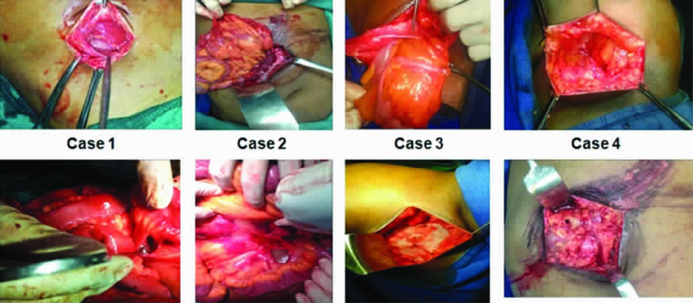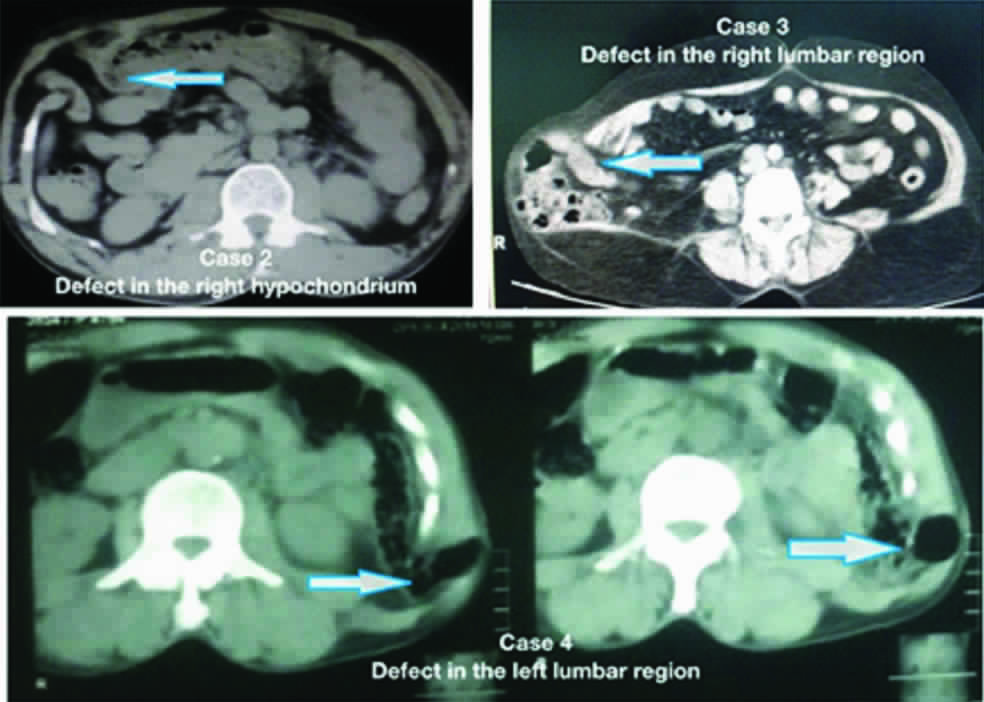 Traumatic Abdominal Wall Hernia (TAWH) goes by the following definition-“herniation through disrupted musculature and fascia, associated with adequate trauma, without skin penetration and no evidence of any prior hernia defect at the site of injury”. These hernias are rare presentations of blunt trauma to abdomen and prevalence is less than 1% even in dedicated trauma centres [1]. Here, we present four cases of abdominal wall hernia following blunt injury to the abdomen.