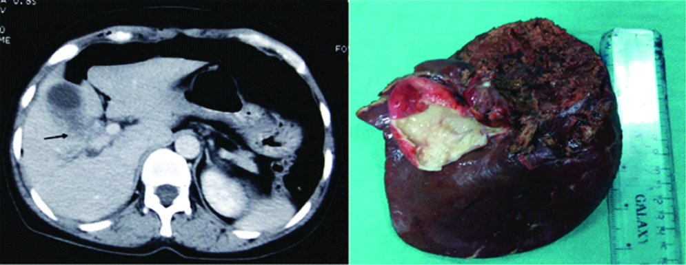 The mean age of the patients was 50.8 years. Three (50%) patients were having below normal BMI as per WHO classification with mean value of 17.7 kg/m2 [Table/Fig-3]. Five patients (83.3%) were in ASA 2 category and one patient was in ASA 3 category. The associated comorbidity (Type 2 diabetes mellitus) was present in one (16.6%) patient. Obstructive jaundice was seen in three patients (50%). Five patients (83.3%) required major hepatectomy for malignant cause [Table/Fig-4,5]. Concomitant bile duct excision with reconstruction was required in three patients (50%). None of the patients in present study was in acute cholangitis or severe malnutrition requiring preoperative biliary drainage/portal vein embolisation. Two patients requiring concomitant bile duct resection and one patient with left hepatectomy for intrahepatic cholangiocarcinoma developed bile leak (Grade B) in postoperative period, which was managed with radiological percutaneous drainage (Clavin-Dindo Grade III) [Table/Fig-2,3]. None of the patient developed post-hepatectomy liver failure despite few patients with high serum bilirubin (>10 mg%) undergoing upfront surgery. There was no reoperation, readmission or mortality for any complication. Two out of the five patients with malignant aetiology underwent postoperative adjuvant chemotherapy. After mean duration of 12.8 months follow-up of all patients are performing well with one patient having disease recurrence.