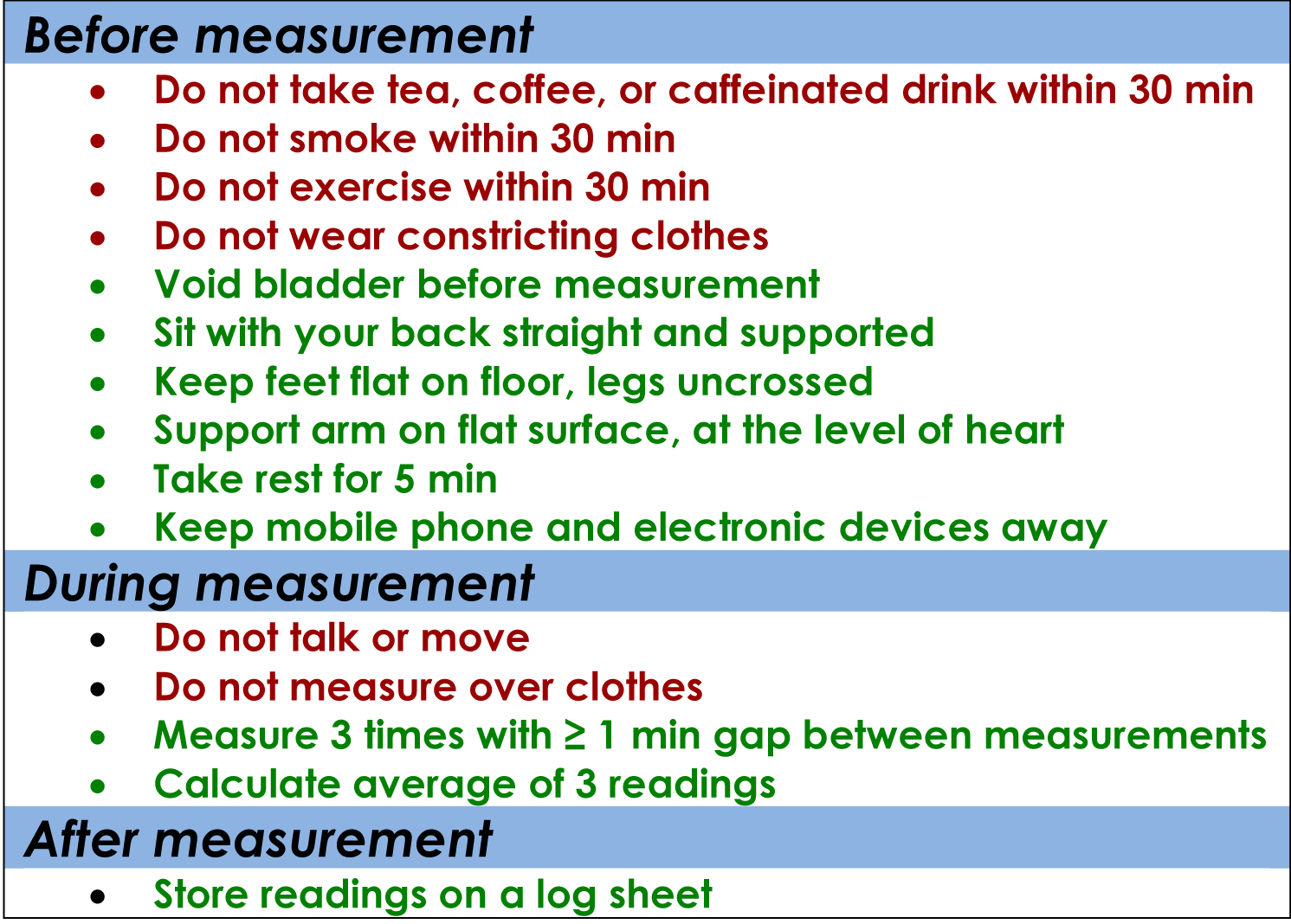 Precautions to take before, during and after blood pressure measurement by automated blood pressure monitors.