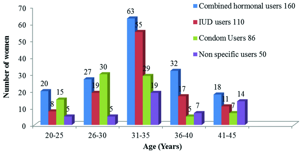 Out of 406 women sampled, 160 (39.4%) women were combined hormonal users, 110 (27.1%) women were IUD users, 86 (21.2%) women were condom users and 50 (12.3%) women with non-specific user of methods including lactation, amenorrhoea and coitus interruptus were considered as control group. Although majority of the women in each age group used combined hormonal contraceptives and the use of contraceptives by women increased with ages ranging from 20 to 35 years and decreased from 36 to 45 years, contraceptives were more used by women in ages 31-35, followed by women in ages 26-30 years while women in other studied age ranges had varied patterns of contraceptive usages as shown in [Table/Fig-2].