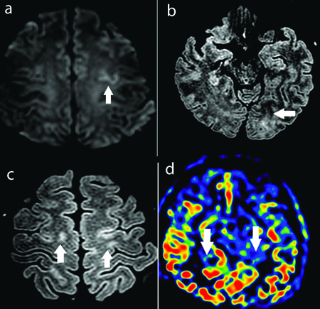 a) Axial DWI images showing focal cortical diffusion restriction in left frontal region (arrows). b,c) Axial FLAIR images showing cortical sub cortical high signal intensity in left occipital region and bilateral fronto parietal parasagittal location (arrows). d) Axial ASL colour map showing patchy region of elevated perfusion in bilateral occipital lobe (arrows).