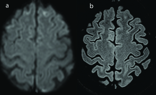 a) T2 FLAIR and b) Diffusion images showing complete resolution of lesions.