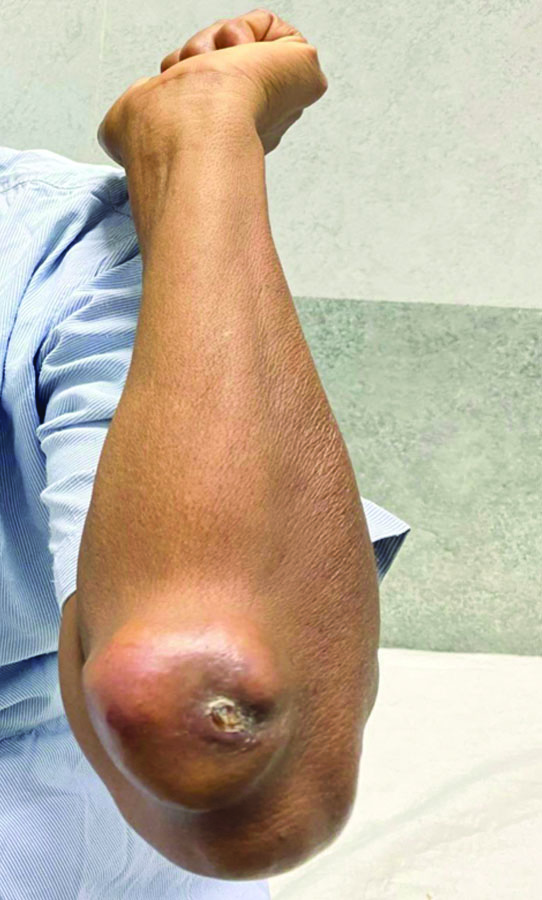 A 55-year-old woman presented to the surgery outpatient department with complaints of swelling near the elbow joint of her left forearm, accompanied by dull, aching pain for one year [Table/Fig-1]. The swelling was initially small, but over 10 months, it gradually increased to its current size. There was no history of locoregional trauma or falls. Upon locoregional examination, a 5×4 cm nodular swelling was observed, which was firm, fixed and tender, with surface ulceration of the skin present on the extensor aspect of the forearm, distal to the left elbow joint. There was no local temperature rise or involvement of the ulnohumeral joint. The general examination did not reveal any swelling at other sites. She did not provide any history of prior surgeries. The levels of electrolytes were within normal limits, and the serum urea and creatinine levels indicated normal kidney function.