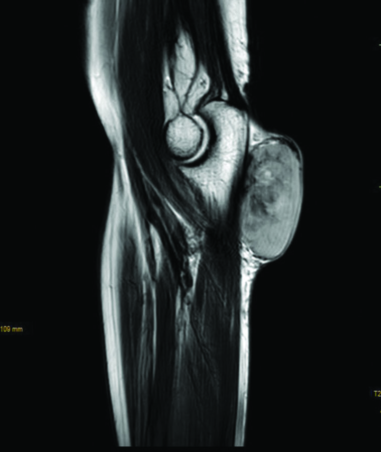 MRI showing well-defined hyperintense subcutaneous lesion.