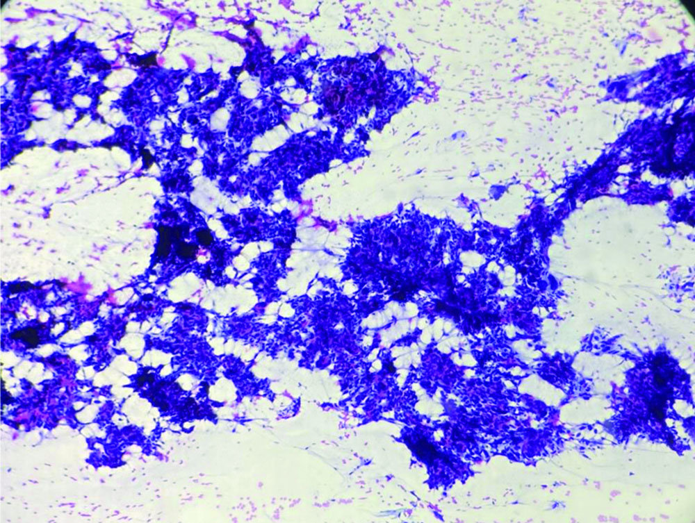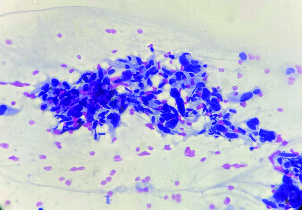 FNA smear shows indistinct and feathery cytoplasmic borders (Papanicolaou stain, 40x).