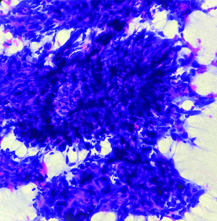 FNA smear shows fragments and clusters of pleomorphic spindle nuclear cells (Papanicolaou stain, 10x).