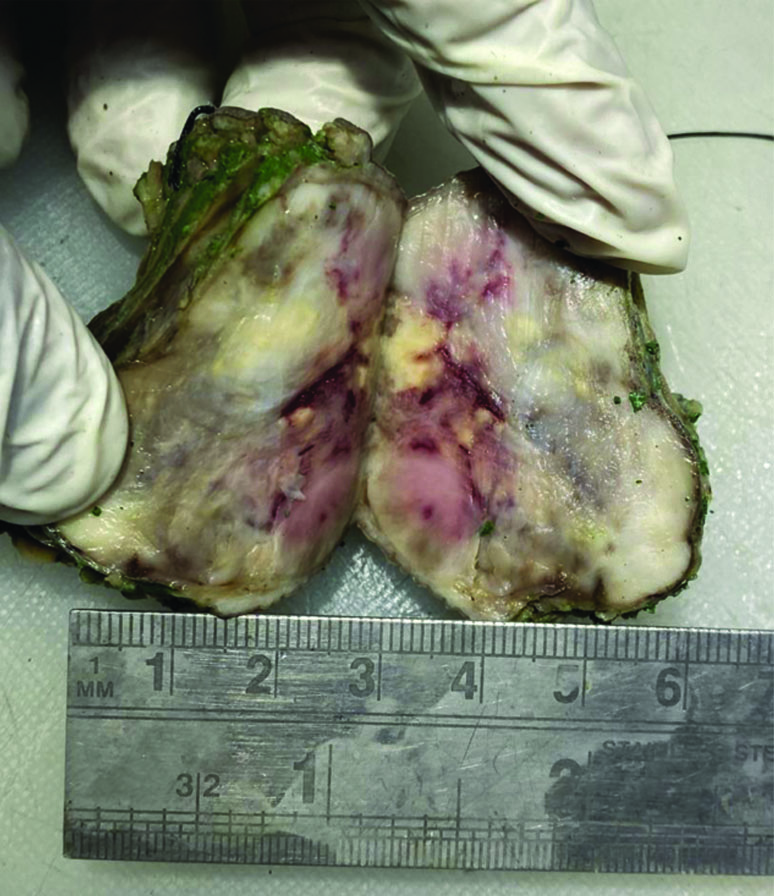 The gross cut section of the tumour mass shows solid heterogenous whitish brown areas.