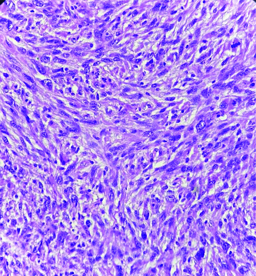Section shows hypercellular neoplasm composed of pleomorphic spindle cells with a high N:C ratio. Occasional mitotic figures are seen (H&E, 40x).