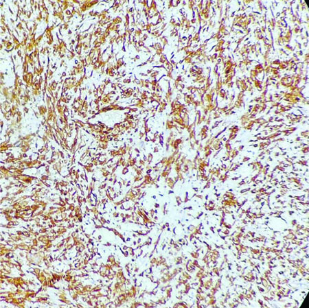 Following the cytodiagnosis, the patient underwent surgical resection of the tumour [Table/Fig-6]. The histopathology revealed pleomorphic spindle cells arranged in a fascicular arrangement. These cells exhibited scant wavy cytoplasm with marked anisonucleosis and a high N/C ratio. The hyperchromatic nuclei contained loose open chromatin, with nucleoli present in some. Mitotic figures were also observed. The histopathological features were suggestive of a malignant mesenchymal tumour [Table/Fig-7]. Immunohistochemical analysis confirmed the diagnosis of MPNST, showing diffuse positive immunoexpression for S-100 [Table/Fig-8] and SOX-10. The patient was followed-up by the Institute’s tumour board committee and was initiated on postoperative radiotherapy and chemotherapeutic drugs such as doxorubicin and ifosfamide as part of the adjunctive treatment plan.