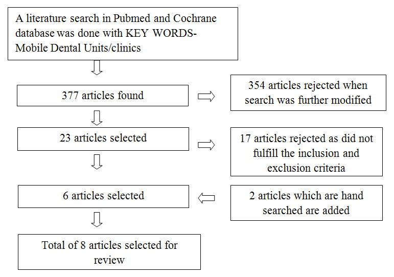 A review of literature was performed in Pubmed and Cochrane library depicted in [Table/Fig-1]. MeSH Terms - “mobile dental units/clinics” were combined in the search. With this combination, a total of 337 abstracts appeared. Out of these 337 abstracts, 23 titles/abstracts were related to research question. Further search criteria (inclusion and exclusion criteria’s) were applied to the articles, out of which six articles, which fulfilled the criteria, were selected for the review. Also, two hand searched article were included in the review.