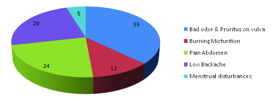 Results: Out of 100 women with symptomatic vaginal discharge, specific diagnosis was obtained in 89% of cases whereas no specific aetiology was found in 11% cases. Mean age was 32.60 years. Fifty-three percent patient had Bacterial vaginosis, candidiasis was found in 14% cases, 16% had Chlamydia trachomatis infection while Trichomonas vaginalis infection was detected in 6% cases. Homogenous discharge was most prevalent (52%), followed by mucopurulant discharge in 23% of women.