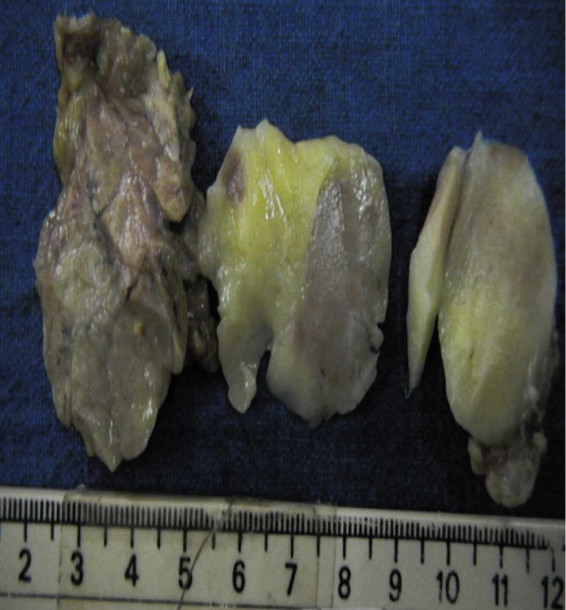 Gross specimen showing lobulated tumour with grey-brown, firm oncocytic component with adjacent greasy-yellow lipomatous component