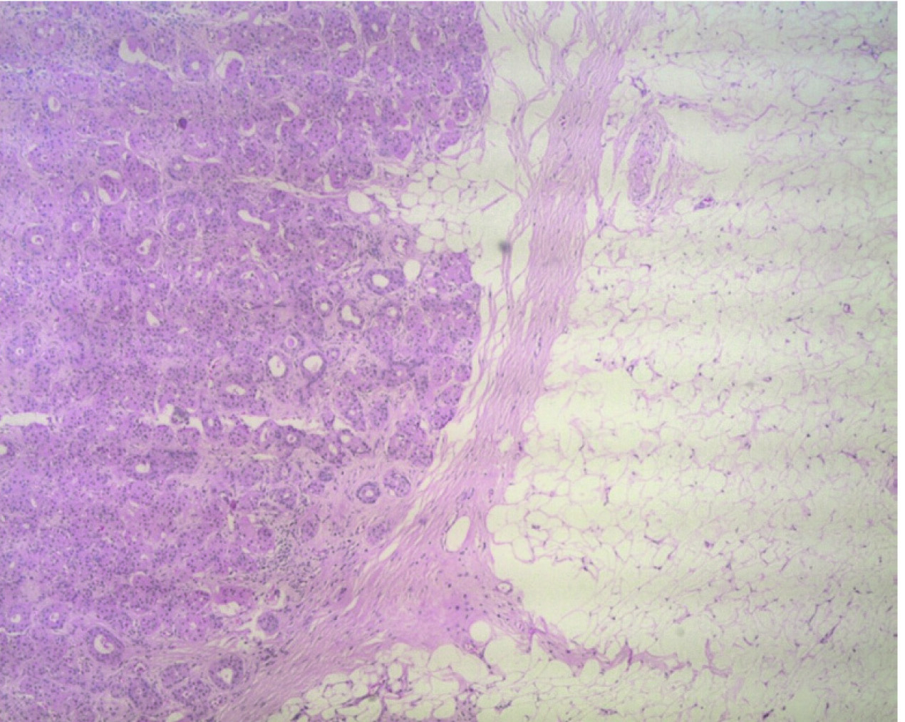 H&E stain, low power view.Oncocytic nodule on left side, lipomatous lesion on right side (10X)