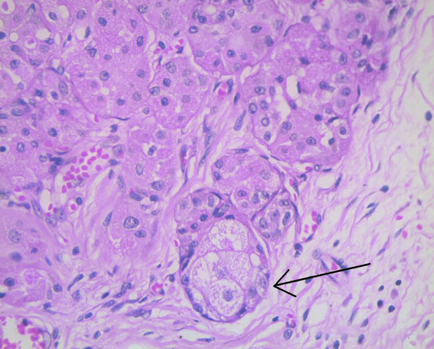 Left salivary gland was enlarged with a large fatty lesion, 55mm x 45mm x 20mm, having a large mural component. Lesion had solid component in it measuring approximately 27 x 17 mm. with a few mottled densities [Table/Fig-1]. There was no significant lymphadenopathy. Surgery was done under general anaesthesia. Patient was positioned on a shoulder roll with head tilted to right side. Painting with betadine lotion was done followed by drapping. The incision was made in the skin crease 5cm below the angle of mandible and deepened through platysma. Both superficial and deep lobes were identified with preservation of mandibular nerve and hypoglossal nerve with ligation of facial artery and facial vein. A 5 × 5 cm large mass arising from the left submandibular gland was excised and submitted for histopathological examination. After securing complete hemostasis, cervical fascia and skin flaps were sutured back in position. Grossly, the tumour was lobulated, encapsulated mass with well-defined brown areas and adjacent greasy-yellow soft areas [Table/Fig-2]. Histopathology examination revealed circumscribed tumour composed of lobules and sheets of oncocytes [Table/Fig-3,4]. Also, present were sheets and lobules of mature adipocytes, some of which are entrapped by the oncocytic nodules [Table/Fig-3,4]. There was patchy periductal chronic inflammation and fibrosis. There was focal sebaceous metaplasia at the edges of oncocytic nodules [Table/Fig-5]. There was no evidence of lymphovascular or perineurial invasion or any extra capsular invasion. Immunohistochemistry was not indicated in this case due to obvious morphological findings, which were consistent with those mentioned in the literature. On a telephonic follow up, no recurrence of symptoms so far. Patient is due for a yearly follow-up during which imaging will be carried in case there is any clinical evidence of recurrence.
