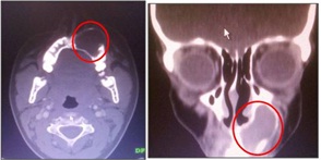 OPG confirmed our diagnosis and supplemented by showing deviation of 23,24 in order to accommodate the radiolucent mass which was a typical finding in present case [Table/Fig-5]. On performing Fine Needle Aspiration Cytology (FNAC) it showed straw coloured fluid was collected and cytology confirmed presence of paucicellular cells like polymorphs, macrophages and few squamous epithelial cells. CT scan in axial and coronal view suggested radiolucent growth in relation to left side of maxilla involving 21,22,23,24 [Table/Fig-6].
