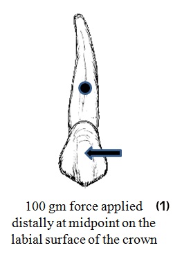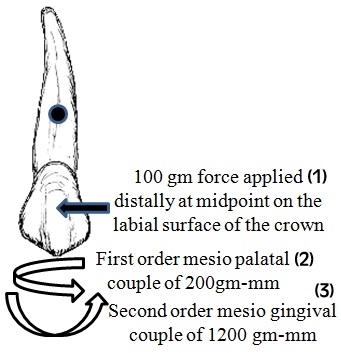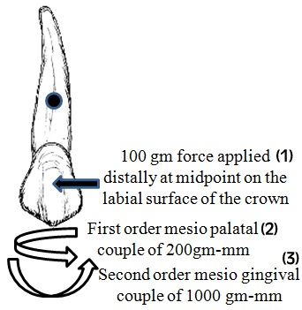 The ‘second order mesio-gingival couple’ at which there was generation of uniform stress on the distal surface of canine gave the location of centre of resistance on that particular model, and also determined the most ideal force system producing uniform stress for that model (at 100gm constant distal force).