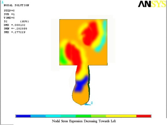 Stress analysis: The stress in the tooth, periodontal ligament and alveolar bone, on applying the loading conditions on the model with no bone loss were initially calculated at different occluso-gingival levels & various surfaces around the tooth [2] [Table/Fig-3,4 and 5]. Then calculations were done after reducing the height of the alveolar bone by 2, 4, 6, and 8 mm [Table/Fig-6]. The computer generated model images in which the different maximum tensions reached in each area were represented by different colours [Table/Fig-7]. The results of the FEM analysis showed the areas of tension and compression in the various parts of the tooth & periodontium. The resultant stress (Sr) at the subject points was calculated. Sr measured the resultant stress at a point by computing stresses in all the three planes and stresses of all the types in a single plane. The evaluation and assessment of the stress distribution during various types of tooth movement on application of Orthodontic force, at various levels of alveolar bone loss was done. Firstly, the stress values & distribution were evaluated for all the movements & loading conditions on model 1 to model 5. An appraisal of the tooth movement occurring in the models (M1 to M5) under various loading conditions was done. Then the change in stress values (whether increasing or decreasing) with progressive bone loss was appreciated.