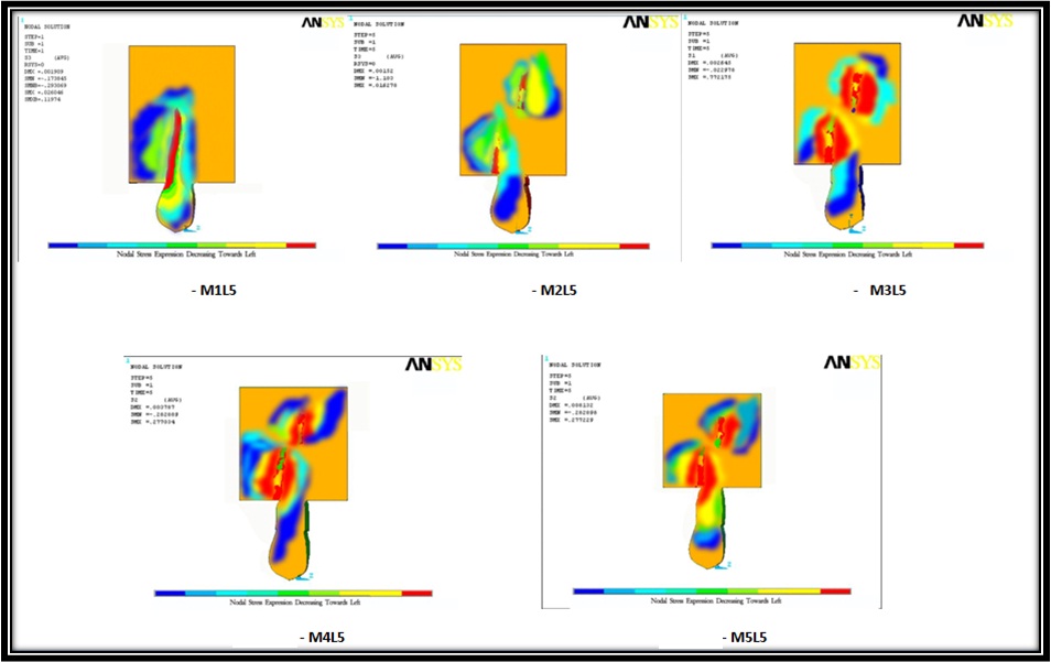 Determination of the ideal force system: To determine the most ideal force system producing the Optimum Stress (i.e. stress within optimum range), uniformly (conducive to bodily movement of maxillary canine with varying degrees of bone loss), Second order mesio-gingival couple (Mc) was applied on each master model (M1 to M5) and this time it was varied in magnitude until a uniform compressive stress loading was generated on the entire distal surface of the canine. The force was maintained as a constant 100 gm distal force.