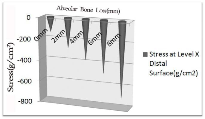 The stress graphs showed the relation between alveolar bone loss and stress generated. The X-axis depicts the progressive bone loss, whereas the Y-axis shows the change in stress.