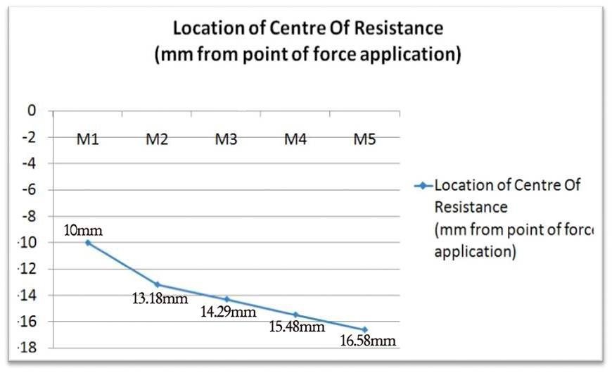 Centre of resistance location: Various studies have shown that bone loss causes center of resistance modification and it moves toward the apex [3,4,7,10]. The present study also shows that the centre of resistance migrates apically with alveolar bone loss & thereby is in accordance with the above mentioned studies. The centre of resistance locations in the models (M1 to M5) were in close agreement with another study [7].