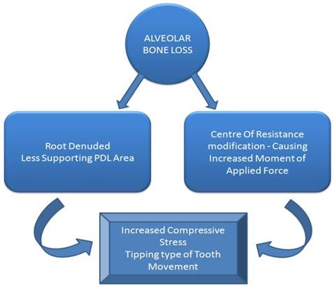 Bone loss and Type of tooth movement: Alveolar bone loss makes the tooth more prone to tipping & alveolar bone height affects the patterns of initial tooth displacements and hence the type of tooth movement [7].
