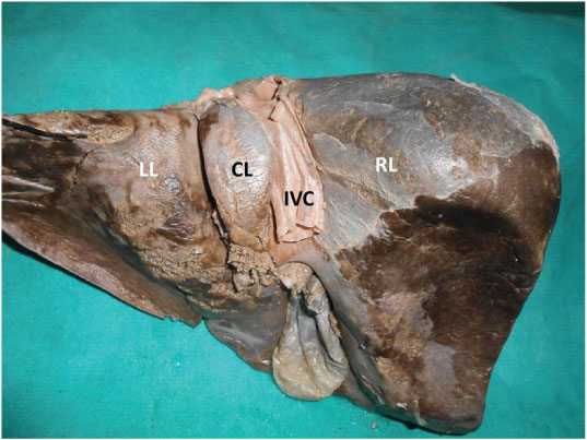 This was a cross-sectional study, conducted in the month of February 2016. A total of 95 adult livers preserved in formalin tanks were used in this study. The livers belonged to cadavers, whose age ranged between 40 to 90 years. Gender wise separation was not done but approximately 10% of the livers belonged to female cadavers. Only healthy looking livers with presence of right and left lobes were used in the study. The livers with damaged lobes and obviously diseased ones were excluded from the study. In this study, we specifically observed the direction/course of hepatic segment of IVC (the part of IVC situated in the groove for IVC) and also noted its relationship with the liver. The direction/course of IVC was categorized as: i) Straight; and ii) Curved. The curved course was further classified as: i) curved to the left; and ii) curved to the right. The percentage of their incidence was calculated. As for its relationship with the liver, it was classified as: i) IVC completely encircled by liver tissue from all sides; ii) IVC covered by liver tissue on front and sides (right and left); iii) IVC covered by liver tissue on front, sides and both (right and left) edges of posterior surface; iv) IVC covered by liver tissue on front, sides and left edge of posterior surface; v) IVC covered by liver tissue on front, sides and right edge of posterior surface; vi) IVC covered by liver tissue only from the front. The percentage occurrence of these relations was calculated. Photographs of livers representing each of these categories were taken.