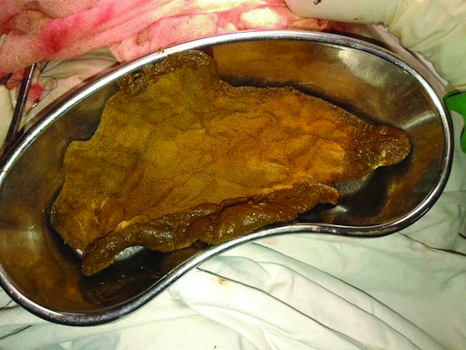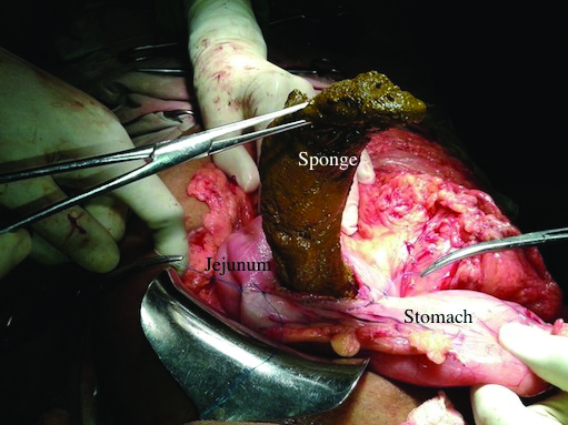 On admission patient was dehydrated, pale with pulse of 110/minute and blood pressure of 90/60mmHg. On abdominal examination tenderness, guarding & rigidity was present all over the abdomen. X-ray chest showed evidence of free gas under diaphragm suggestive of perforative peritonitis. Patient was started on intravenous antibiotic and resuscitated with intravenous fluid. A high risk consent was taken in view of old age and preoperative haemodynamic unstability for exploratory laparotomy for perforative peritonitis. Intraoperatively there was 200cc bilious contamination along with a 5x3cm perforation on the anterior wall of first part of duodenum. In view of the large perforation, a decision to proceed with billroth II anastomosis was taken. However after resection, when an enterotomy (jejunotomy) was performed for gastrojejunostomy, an intraluminal mass was found in mid jejunum which when removed turned out to be a surgical sponge. Intraoperative images were taken and it was bought to the notice of the assisting surgeons, sister and findings were informed to seniors. The sponge was removed meticulously [Table/Fig-1,2] and gastro-jejunostomy was eventually performed. A detailed note of the same was made in the operative notes along with the date and time of the findings. A medico-legal entry was made in the hospital records and the sponge was handed over to the police authorities after notifying and showing it to the relatives [Table/Fig-3]. The relatives of the patient were unwilling to pursue the case further. Postoperatively patient was kept on ventillator and haemodynamic support. Patient could not be weaned off it. Progressive deterioration of all clinical and laboratory parameters were observed over next two days and this resulted in cardiac failure on postoperative day 2 following which the patient died.