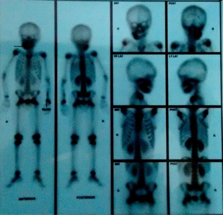 A 99 TC-MDP whole body scintigraphy showing an increase tracer pooling in the right side of the mandible with no evidence of bony metastasis at other sites of the body.