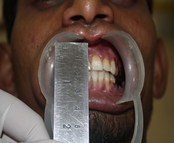 As shown in [Table/Fig-6] the length and width of the flap was marked and decided according to the need so that it can be rotated and reached to the joint space without any gratuitous stretching. The flap was rotated over the zygomatic arch and was sutured anteriorly, posteriorly and medially so that it covers the arthroplasty site completely and proficiently. Layer by layer suturing was carried out and surgical drain was placed [Table/Fig-7]. Physiotherapy was started from the first post-operative day with jaw exercises under supervision [Table/Fig-8]. It was intensified gradually in the post-operative and recall period and MMO was noted at regular follow-up maximum up to 5 years. Aggressive physiotherapy was carried out in subsequent visits [Table/Fig-9].