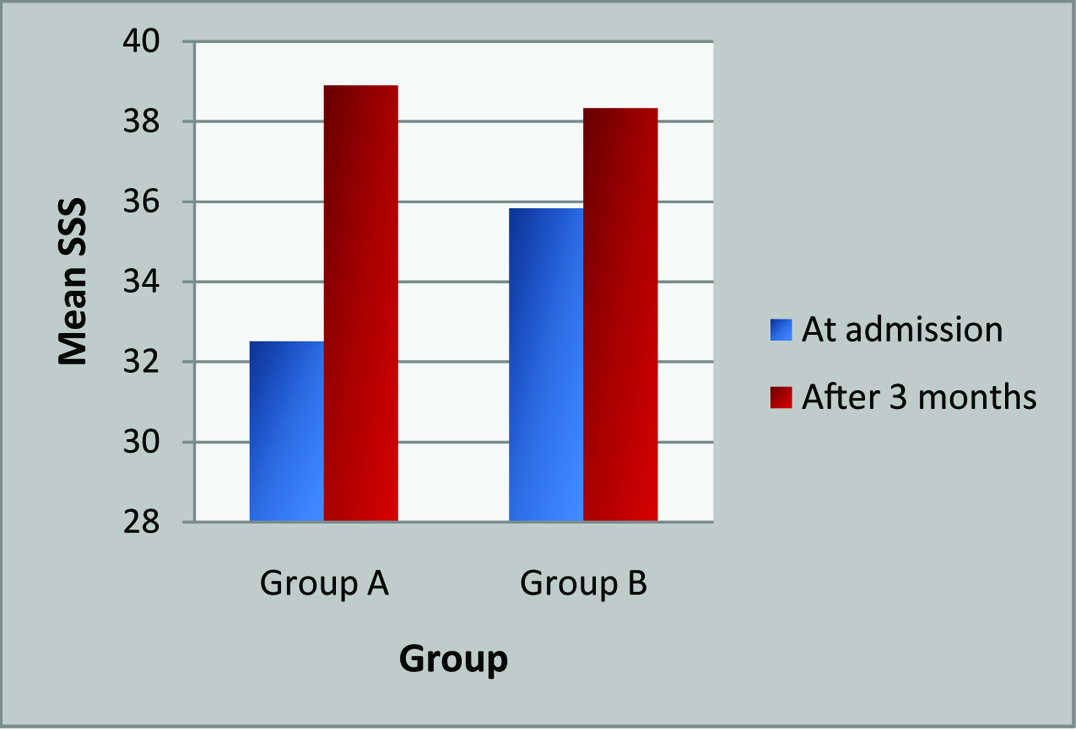 Mean±SD of SSS at time of admission and after three months in Group A was 32.50±11.61 and 38.89±8.34 respectively. Mean±SD of SSS at time of admission and after three months in Group B was 35.82±8.56 and 38.32±7.10 respectively as shown in [Table/Fig-3].