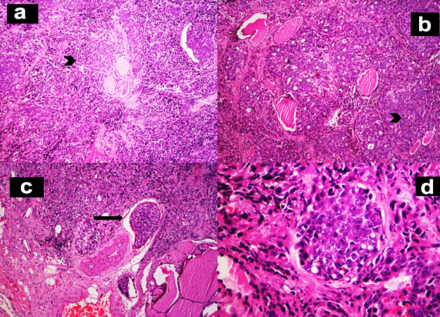 a,b-Interstitium of thyroid gland is infiltrated by sheets and nests of atypical cells (H&E,x100); c-Lymphatic emboli are evident (H&E,x100); d-These atypical cells have high nucleocytoplasmic ratio, vesicular nuclei and prominent nucleoli (H&E,x400);