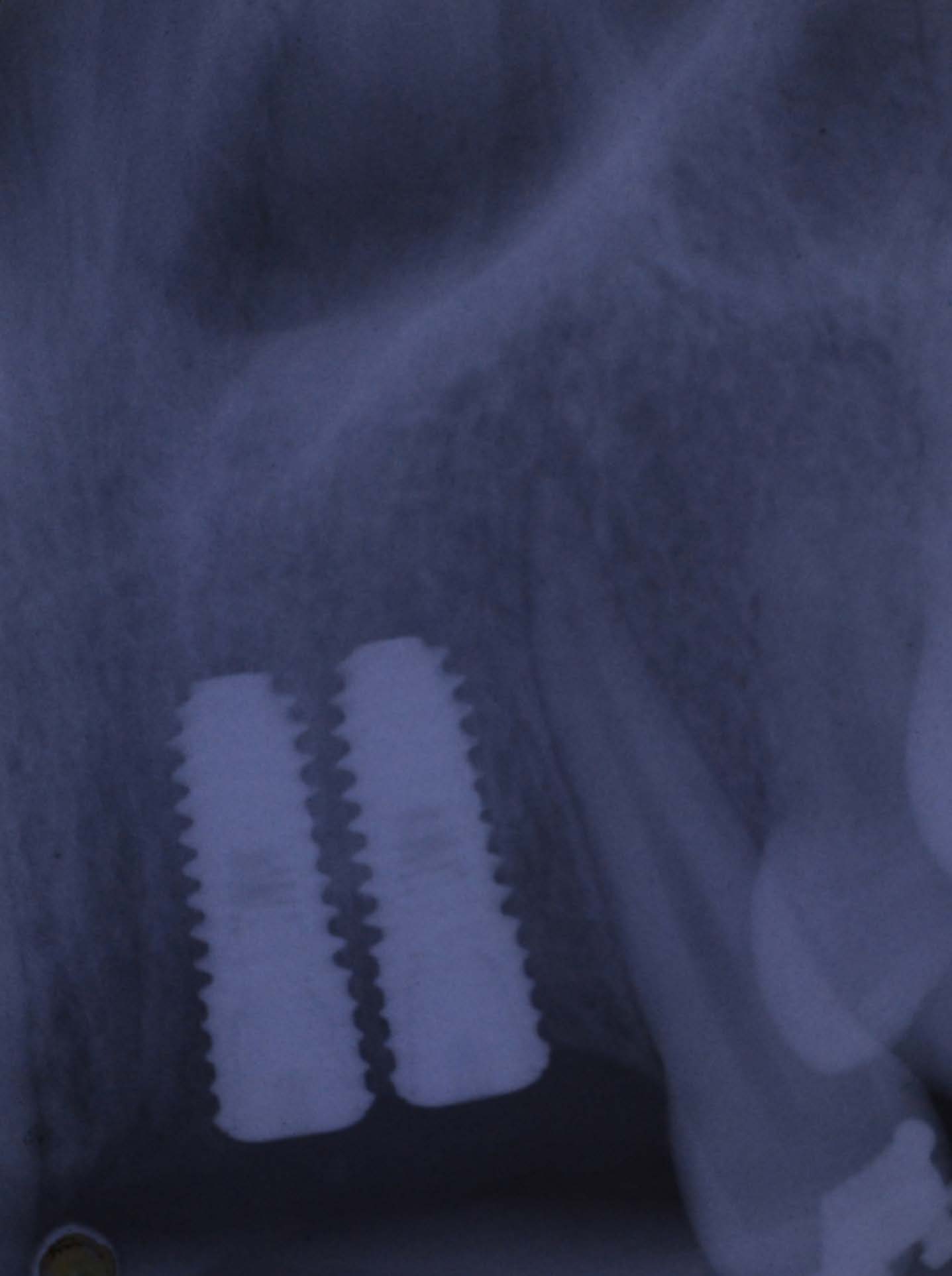 Intra oral peri apical radiograph depicting the crestal bone after three months of immediately placed dental implant augmented with Platelet Rich Fibrin (PRF) membrane at juxta-crestal bone around dental implant.