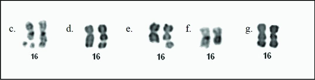 Expression of FRA16B in cultured lymphocytes: c) Triradial configuration; d) Chromosome gap; e) Chromosome break; f) Deletion; g) Homozygosity for FRA16B.