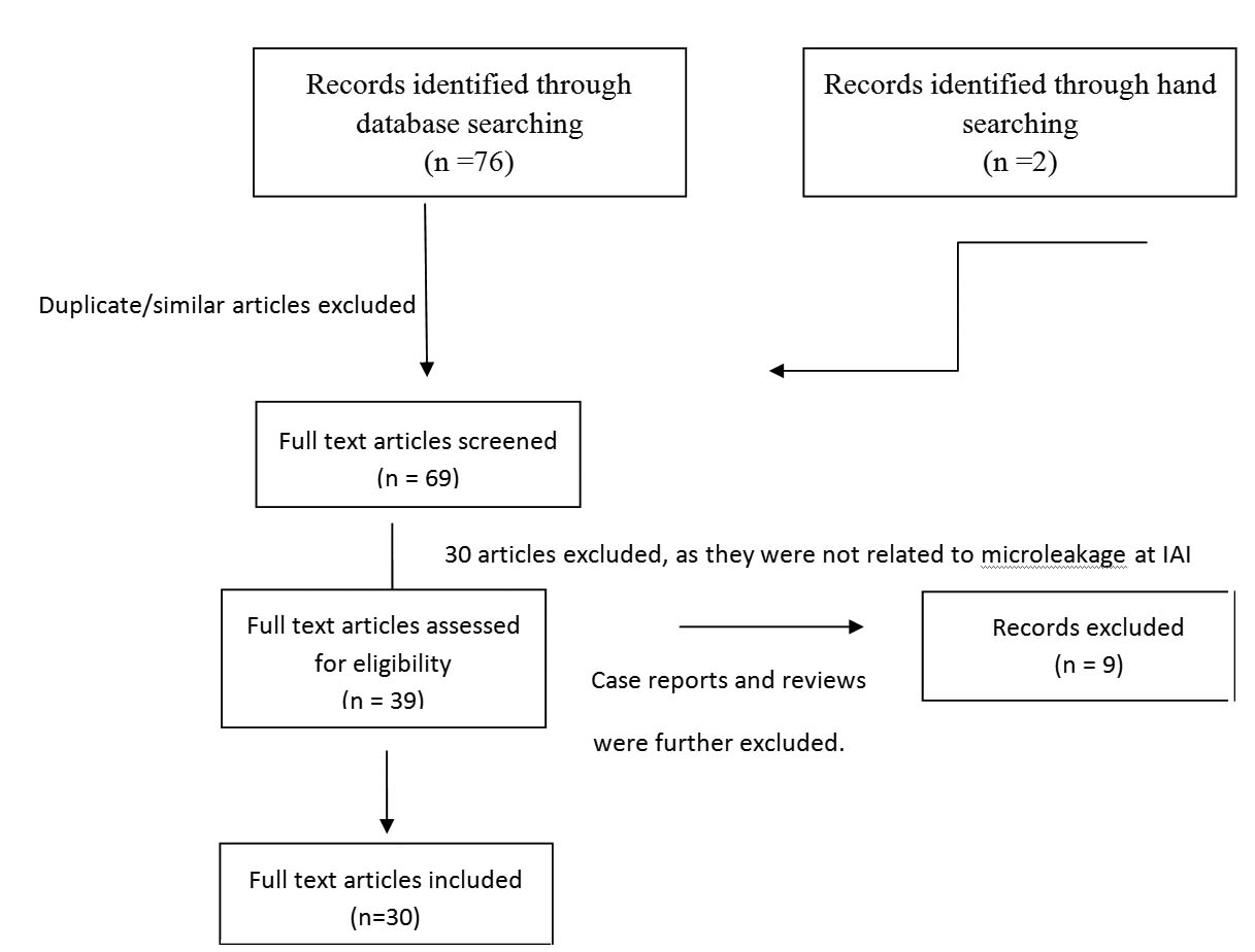 | Mencio F et al., [33] In vitro | n=12 | Screwed connection; Cemented connection | -------- | 14 days | Bacterial species | IAI | PCR-Real time analysis | In both the connections bacterial species penetrated at IAI; The lowest bacterial penetration was shown at cemented connection implants. |
