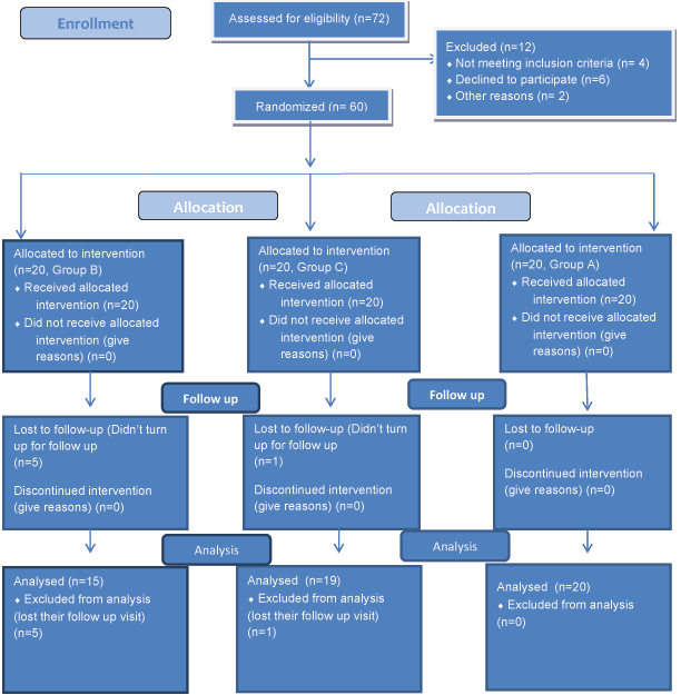 A triple blind randomized controlled trial was conducted at Government Dental College, Calicut, Kerala over a period of one year. Sixty patients with non vital, immature anterior teeth were randomly categorised into three groups in a parallel design [Table/Fig-1]. The computer generated random number table was used to assign the patients into three treatment groups. Group A patients were treated with PRF [8], Group B patients were treated with induced bleeding technique [3], Group C patients were treated with PRP [9]. The patients, the investigator and the evaluator/examiner were unaware of the allocation sequence. Informed consent was obtained from the patients. The study proposal was approved by the Institutional Ethics Committee. Subjects were initially assessed for eligibility at a baseline visit. Age of the patients ranged from 6 to 28 years with 32 males and 28 females. Patients were followed up at 3rd, 6th, 9th and 12th months intervals. At 3rd and 9th month clinical examination alone was performed. At 6th month, only the periapical status (PAI score) was recorded. Since one cannot appreciate much radiographic changes within a short span of three months, the data were not collected at 3rd and 9th month.