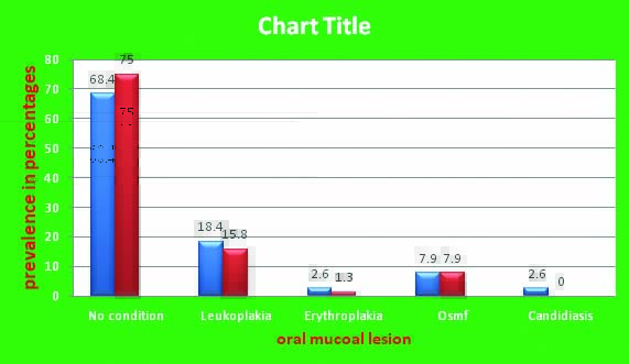 Prevalence of oral mucosal lesions: [Table/Fig-5] showing prevalence of oral mucosal lesions in alcohol dependent subjects and non alcoholic subjects. The prevalence of oral mucosal lesions was high in alcohol dependent subjects (31.5%) compared to non alcoholics (25%). Among the various types of oral mucosal lesions reported leukoplakia had a highest prevalence in alcohol dependent subjects (18.4%) followed by oral sub mucus fibrosis (7.9%), erythroplakia (2.6%) and candidiasis (2.6%).