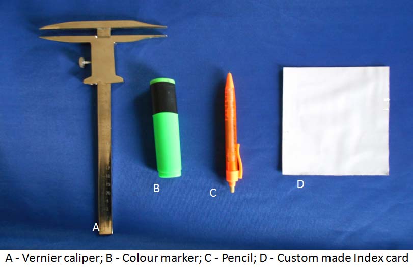 It was a cross-sectional study in which five hundred (250 males and 250 females) healthy subjects of age between 18 to 21 years from Gujarat region had volunteered. None of the participant had any lower extremity deformity, injury or neuromuscular disorder at the time of assessment. The author obtained ethical clearance from Institutional Ethical Committee and informed consent from the participants before undertaking the study. The materials used for this study were custom made index card and Vernier caliper [Table/Fig-1]. The demographic data such as gender, age, height, weight of each participant were recorded. The ND was measured applying Brody Method [3].