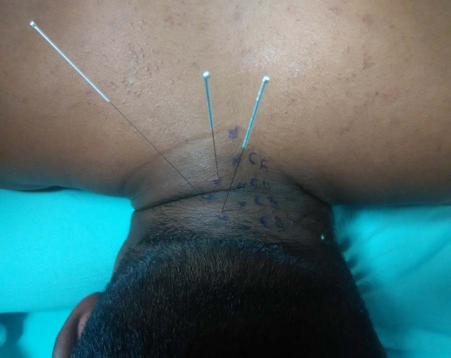 Prior to the PSDN, the possible therapeutic and adverse effects of dry needling were explained and a written informed consent was obtained from all the patients. Then, patients were positioned in prone lying; the area of skin over the cervical spine was cleaned and sterilized with isopropyl alcohol (Alco-Swab®:70% alcohol content). Information regarding the possible mild pinpricking sensation was given to the patients while inserting the dry needle [8]. Tender spot of target locked facet was identified and the needling spot was marked 1.5 cm lateral to the supraspinal line (tip of the spinous process) [10,14]. Similarly, needling spots for one adjacent superior and inferior vertebral segment were marked just 1 cm lateral to the respective cervical vertebra’s spinous process [10,11]. Then the sterilized dry needles (30 mm thick × 25 mm length, Cloud & Dragon®, Jiangsu, China) were inserted into the deep cervical back muscles from the marked sites till it reaches the cervical multifidi with slight infero-medial direction [Table/Fig-2].