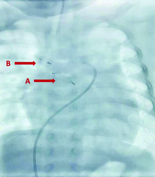 A five-month-old male baby (weight: 4 kg) was presented with chief complaints of recurrent respiratory tract infection, shortness of breath, and failure to thrive. He was born by a normal vaginal delivery with birth weight of 2.3 kg. He became symptomatic at the age of 2 months with suck-rest–suck cycles, respiratory tract infection, and failure to thrive. A month back, he was hospitalized for pneumonia and repeated respiratory failure. He was kept on anti-failure medications comprising furosemide 2 mg twice daily and ramipril 0.2 mg once daily. On clinical examination, he displayed tachypnoea, irritability, excessive crying, intercostal and subcostal retractions, and tachycardia, with no signs of congestive cardiac failure. He had loud P2 with harsh continuous murmur dominantly heard on right interscapular, infrascapular, and right parasternal area. Chest X-ray showed cardiomegaly and pulmonary plethora of moderate severity mainly in the right lung. Echocardiography showed severe tricuspid regurgitation and severely dilated right atrium, right ventricle, and pulmonary arteries [Table/Fig-1,2]. Pulmonary artery pressure, derived by tricuspid regurgitation jet velocity, was suprasystemic (111 mmHg). No other structural abnormality was seen. Computed Tomography (CT) angiogram showed a large MAPCA, arising from the descending thoracic aorta and supplying blood to the right upper and middle lobes [Table/Fig-3,4]. In view of worsening symptoms, we decided to carry out percutaneous closure of MAPCA.