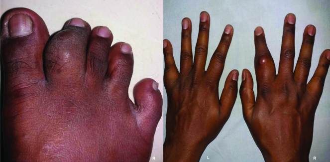 On general examination, he was afebrile (temperature <37°C), with no pallor, icterus and lymphadenopathy. He had pulse rate of 72/minute and blood pressure of 120/80 mmHg. The swellings were fusiform in shape and firm to hard in consistency involving proximal half of right second toe, thumb, index and little fingers of left hand and also involving index and little fingers of right hand [Table/Fig-1]. There was mild increase in local temperature and tenderness on deep palpation along with restricted movement of the affected fingers. His cardiovascular, pulmonary, abdominal and neurological examinations revealed no abnormality.