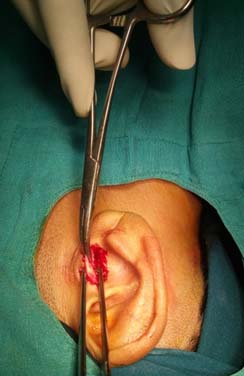 All selected patients were subjected to thorough history and clinical examination, otomicroscopy, otoendoscopy and hearing assessment by pure tone audiometry. X-Ray mastoids were taken in revision cases to rule out mastoid pathology. Post aural approach and underlay technique was employed in all to maintain uniformity. Cartilage perichondrium composite graft was harvested from tragal or conchal cartilage [Table/Fig-1]. It was randomly selected as to which patient to get tragal or conchal cartilage. Cartilage was thinned out with help of number 15 surgical blade with attached perichondrium on one side [Table/Fig-2]. After inspecting the middle ear and the ossicular status, perforation was closed by cartilage-perichondrium composite graft which was placed with bare cartilage side facing the middle ear and perichondrium to the external [Table/Fig-3].