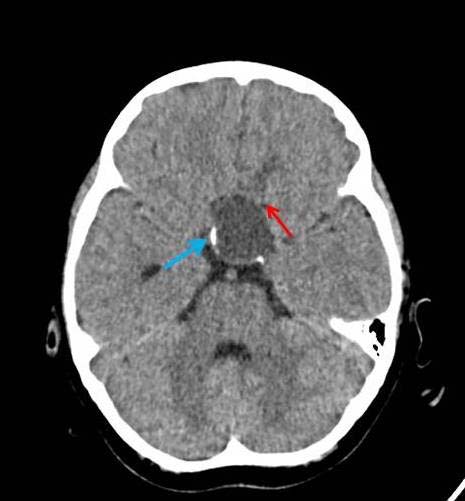 Axial NECT showing cystic lesion measuring 3.5 x 2.6 x 2.2 cm in suprasellar region with presence of curvilinear calcification (blue arrow) with mild oedema of left basifrontal lobe (red arrow).