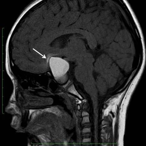 T1WI MR sagittal section showing hyperintense cyst in suprasellar location with isointense solid component in sellar location. Also, note hyperintense signal in brain parenchyma antero-superiorly indicating irritation from leaking cystic fluid due to intra-parenchymal focal rupture (white arrow).
