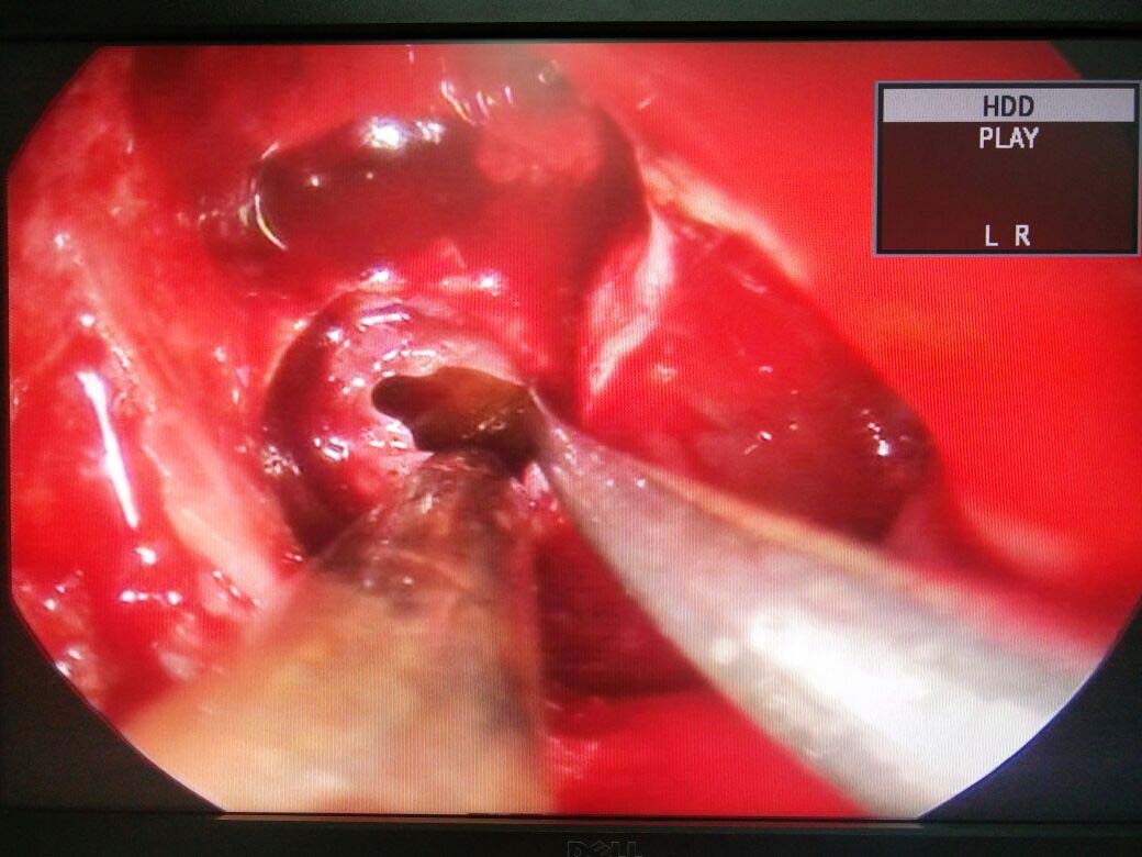 Transnasal endoscopic trans-sphenoidal approach of the lesion showing cyst filled with thick oily yellow coloured fluid of machinery oil appearance.