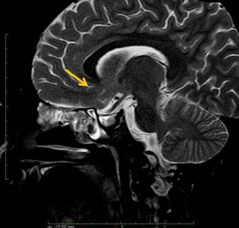 Postoperative (trans-nasal endoscopic trans-sphenoidal excision of the lesion) T2W MR sagittal section showing resolution of brain oedema (yellow arrow).