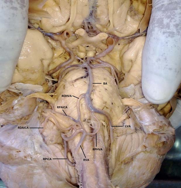 Second branch, the RDHVA originated from the junction of right VA and right PICA, distal to the RPHVA, ascended and crossed the Ponto medullary junction to join the right border of the BA near the middle of the pons. This branch gave an offshoot towards right side at the level of ponto medullary junction called as RPAICA. RPAICA passed obliquely towards middle cerebellar peduncle above the facial and vestibulocochlear nerves and disappeared superior to flocculus of right lobe of cerebellum.