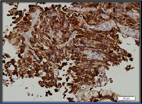 Tumour cells showing cytoplasmic positivity for cytokeratin Immunohistochemistry (IHC); 200X).