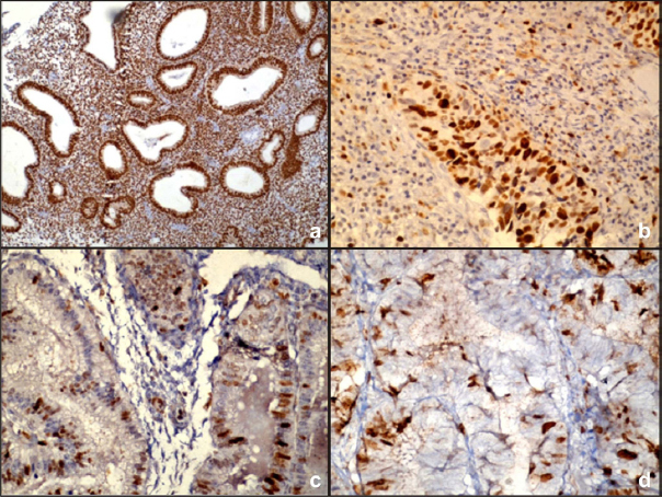 a) ER expression in Grade I endometrioid adenocarcinoma (4X) (ER% 2+ ER staining intensity 1=3 category II); b) PR expression in Grade II endometrioid adenocarcinoma (4X) (PR% 1+ PR staining intensity 2=3 category II); c) p53 expression in uterine serous carcinoma (40X)(p53=25%); d) Ki67 expression in clear cell carcinoma (40X) (ki67=50%).