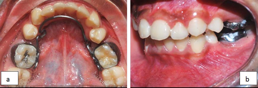 One month later: a) occlusal picture shows the correction of lingually tipped molars; (b) left lateral view showing the correction of scissor bite on left side.